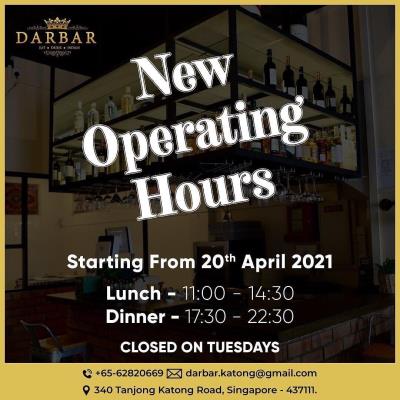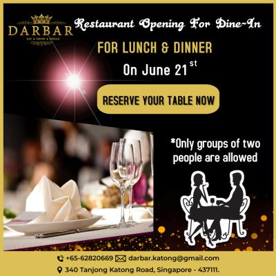 Darbar @ Katong is Opening for Dine-In on 21st June. Only groups of 2 are allowe...