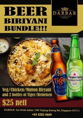 Veg/ Chicken/ Mutton Biryani and 2 bottles of Tiger/ Heineken